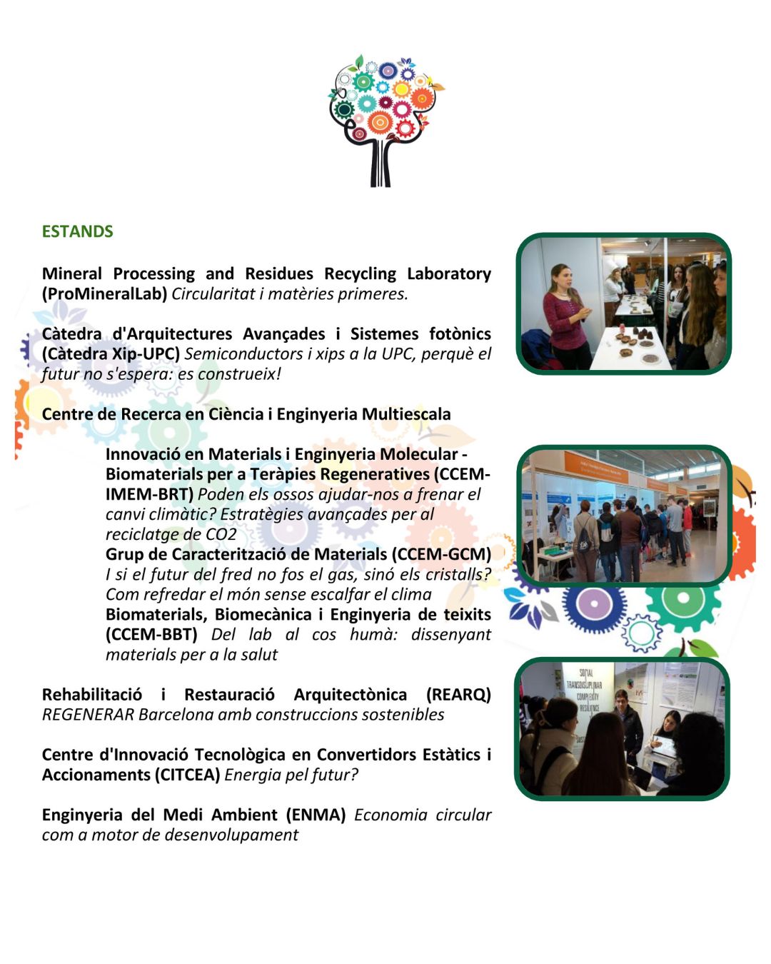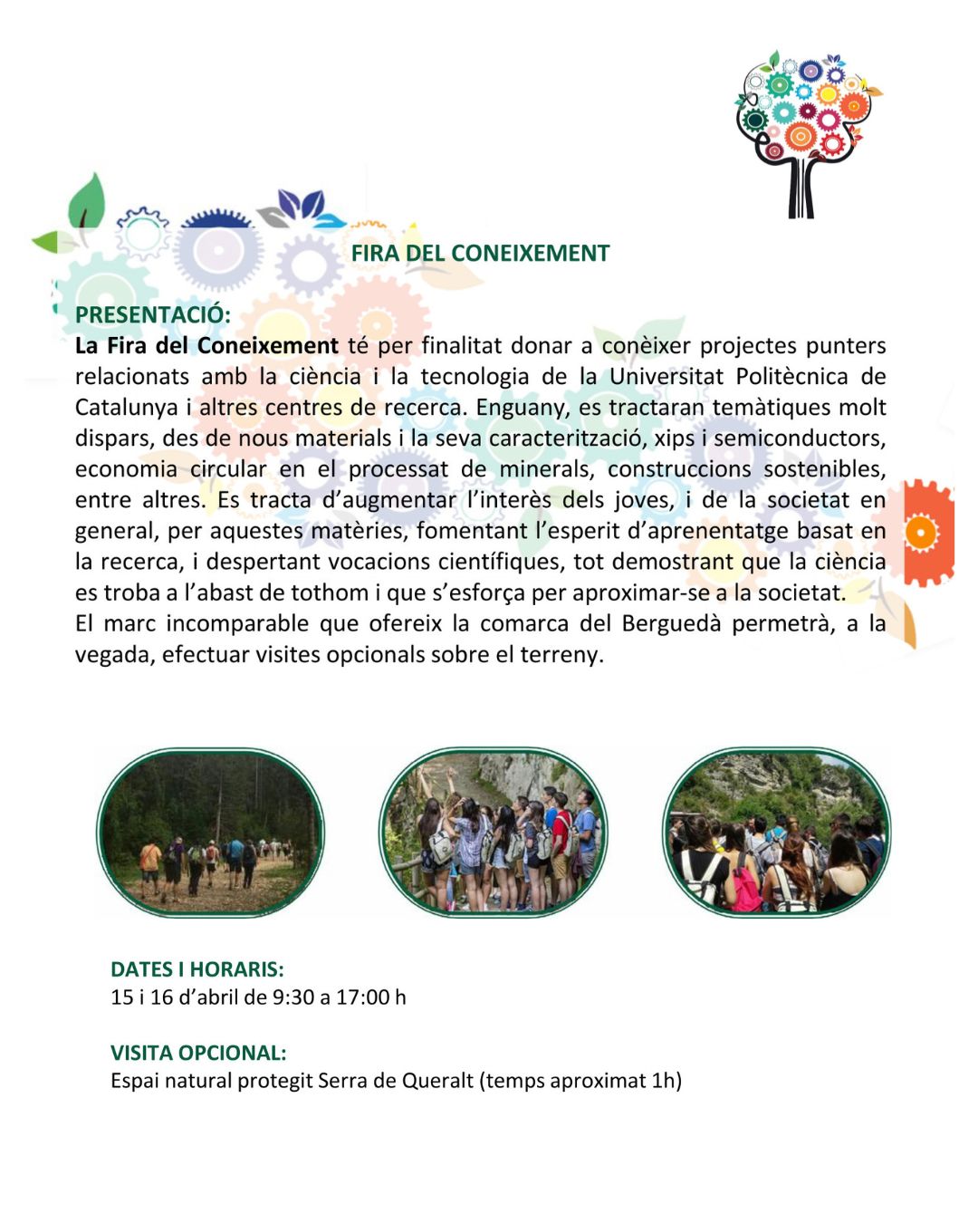 L’alumnat de diferents centres educatius d’Artés, Barcelona, Gironella, Manresa, Martorell, Sant Sadurní d’Anoia, Puig-reig i Terrassa visitaran la fira per conèixer els projectes de vuit grups de recerca pioners impulsats per l’alumnat de la Universitat Politècnica de Catalunya. A més, hi haurà una exposició titulada “Coneixes el bosc” i una visita a l’espai natural de la serra de Queralt.
