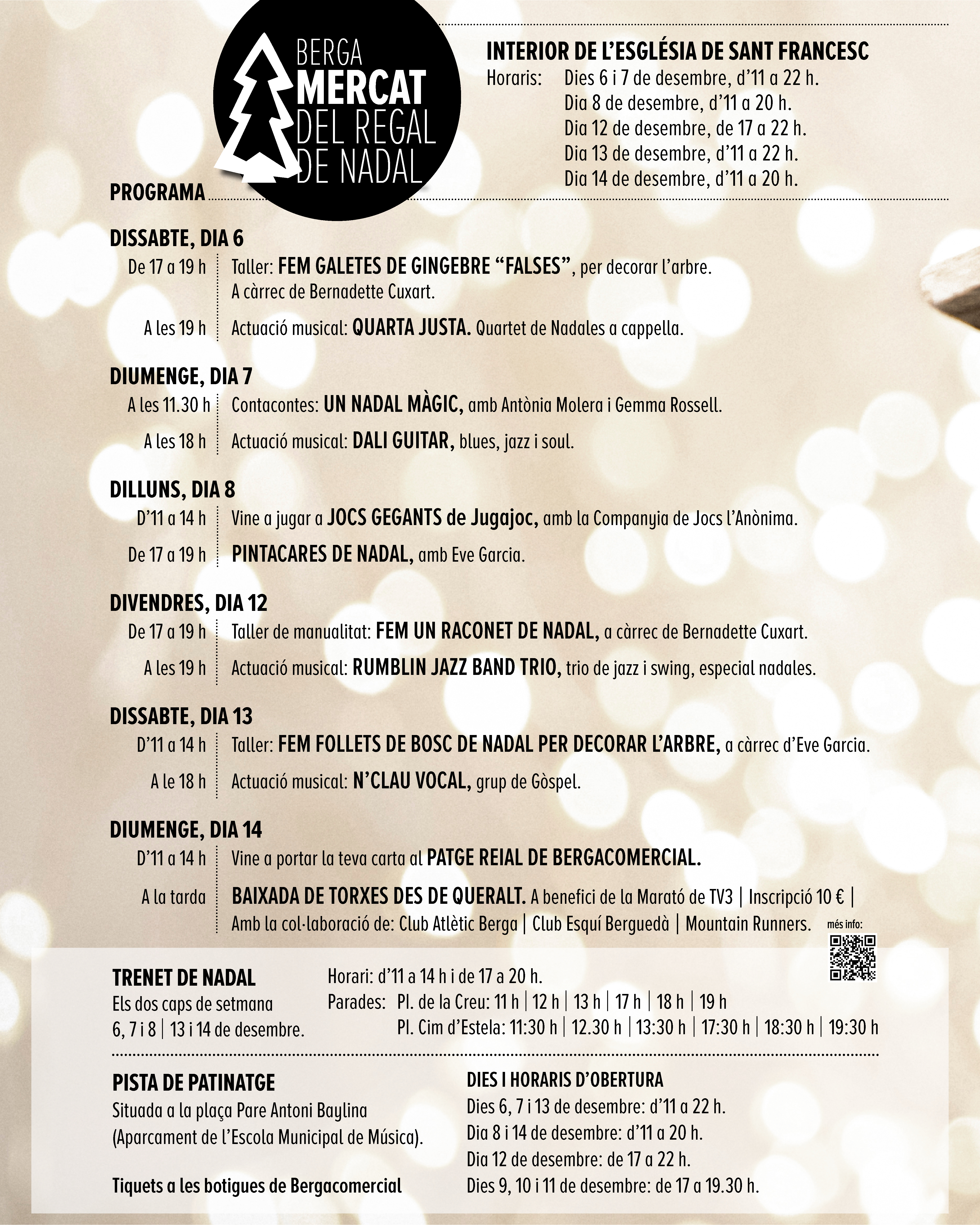 El Mercat del Regal de Nadal és una iniciativa impulsada per l’Ajuntament de Berga i Bergacomercial amb la col·laboració de l’Associació Comarcal d’Empresaris del Berguedà, l’empresa pública BRG Serveis MP, SLU, l’Associació dels Amics de Sant Francesc, Grup Boix i el suport de la Generalitat de Catalunya.