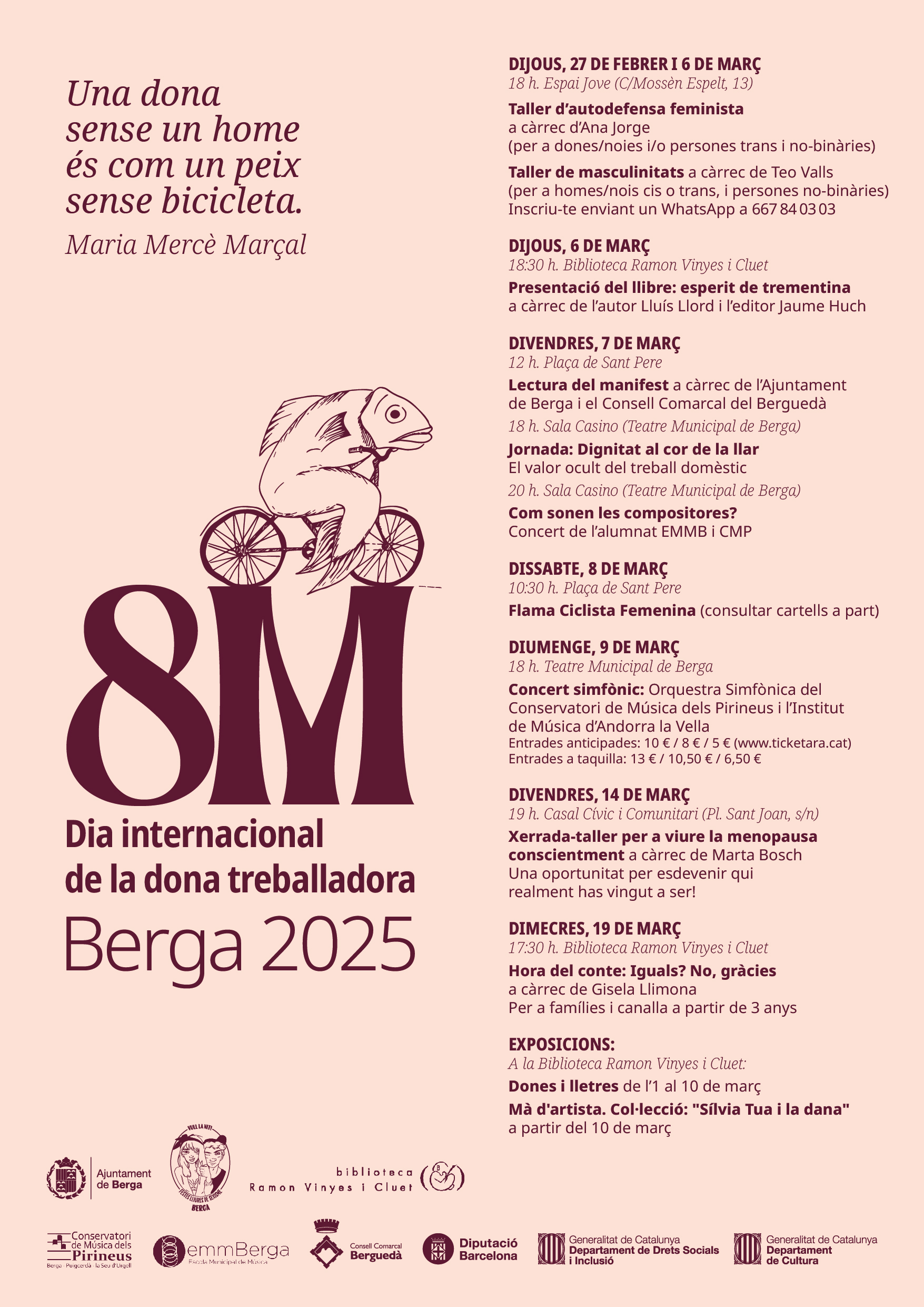La programació del 8M d’enguany està promoguda per les àrees de Feminisme, Joventut i Cultura de l’Ajuntament de Berga, la Biblioteca Ramon Vinyes i Cluet, l’Escola Municipal de Música de Berga, el Conservatori de Música dels Pirineus i el Consell Comarcal del Berguedà amb el suport de la Diputació de Barcelona i la Generalitat de Catalunya.
