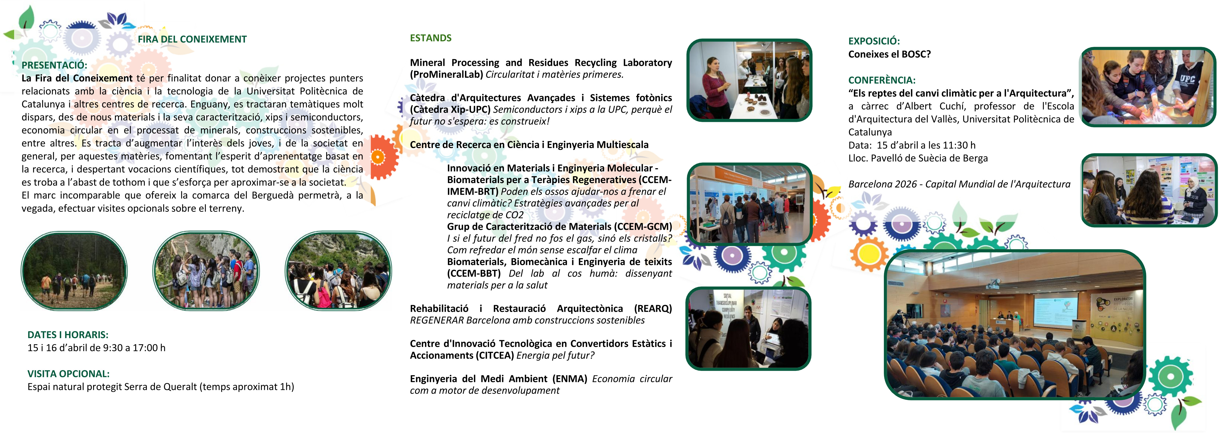 L’alumnat de centres educatius d’Artés, Barcelona, Gironella, Manresa, Martorell, Sant Sadurní d’Anoia, Puig-reig i Terrassa visitaran la fira durant les jornades del 15 i 16 d’abril. La fira també és oberta a la ciutadania i es recomana visitar-la dijous, especialment a la tarda, quan l’afluència d’estudiants és menor (de 15 a 17 h). La Fira del Coneixement és un esdeveniment organitzat per la Universitat Politècnica de Catalunya, l’Exploratori dels Recursos de la Natura i l’Ajuntament de Berga.