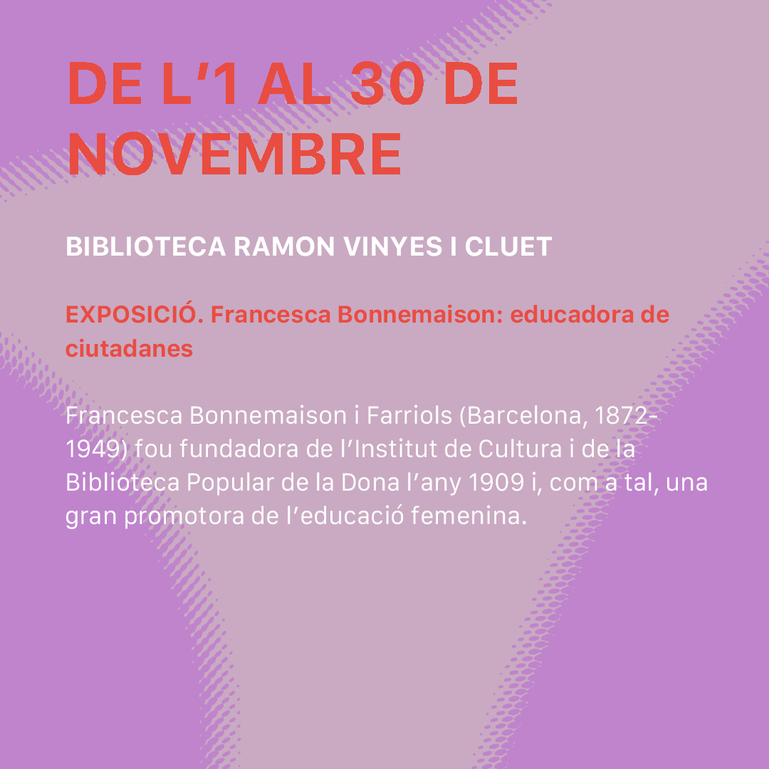 La Biblioteca Ramon Vinyes i Cluet acull l’exposició itinerant Francesca Bonnemaison: educadora de ciutadanes, que es podrà visitar fins al 30 de novembre. Francesca Bonnemaison i Farriols va fundar l'Institut de Cultura i de la Biblioteca Popular de la Dona l'any 1909 i va ser una gran promotora de l'educació femenina. Bonnemaison va ser una activista incansable que va participar en la recuperació de la llengua, la cultura i la tradició catalanes i es va implicar en la política als anys republicans. Va aconseguir mobilitzar i sensibilitzar entorn del seu projecte feminista bona part de la intel·lectualitat del seu temps. Francesca Bonnemaison va ser una dona revolucionària per a la vida de moltes dones, perquè els va facilitar l’accés a l’educació, un element clau per a la seva autonomia i va deixar un llegat en favor de l’apoderament de les dones i la sororitat.