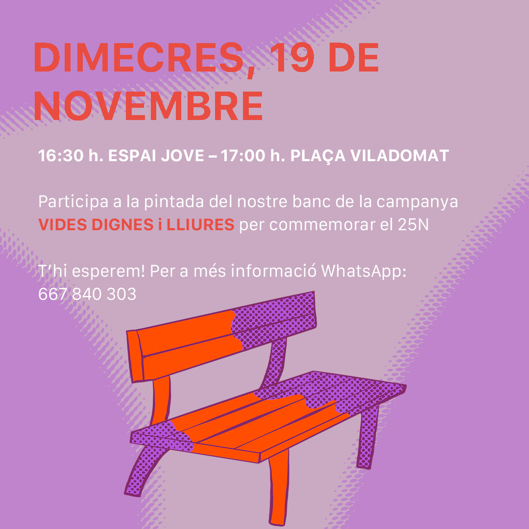 Una altra de les propostes destacades per commemorar el 25N serà una acció compartida entre una dotzena de municipis berguedans. Es tracta d’una campanya impulsada pel Consell Comarcal del Berguedà titulada Vides dignes i lliures... Compartim espais segurs. L’acció consisteix en convertir un element de mobiliari públic en un element simbòlic permanent per reflexionar entorn de les violències masclistes. En concret, l’actuació consisteix en pintar un banc de color lila per prendre consciència que la implicació de tothom és necessària per crear espais segurs i per a l’erradicació de la violència contra les dones. A Berga, la pintada del banc es portarà a terme el dimecres 19 de novembre, a la plaça de Viladomat. Aquesta acció anirà precedida d’una sessió de sensibilització per donar a conèixer la campanya. La sessió informativa es farà a l’Espai Jove (carrer de Mossèn Espelt, 13), a les 16:30 h.
