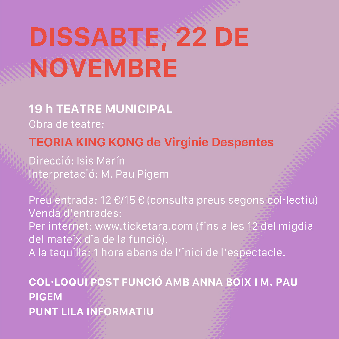 El Teatre Municipal de Berga acollirà la representació de l’obra teatral Teoria King Kong de La Virgueria, dirigida per Isis Marín i protagonitzada per M. Pau Pigem. La funció s’adreça a públic jove i adult a partir de 16 anys i es farà el dissabte 22 de novembre, a les 19 h. A més, hi haurà col·loqui després de l’espectacle i en l’equipament cultural s’habilitarà un espai informatiu de Punt Lila.