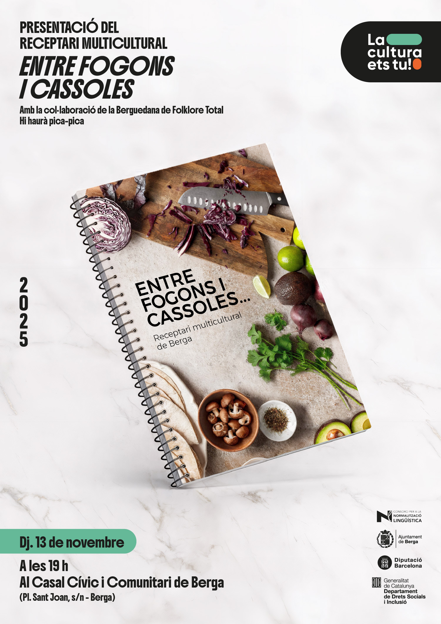 L’Ajuntament de Berga ha impulsat l’edició d’aquest receptari que inclou una vintena de plats per descobrir ingredients i textures, fent una petita volta per diversos continents mitjançant una selecció de receptes dolces i salades amb infinitat de sabors, fent ús del català com a llengua vehicular de la iniciativa. La proposta forma part del projecte ‘La Cultura ets tu!’, una iniciativa que pretén garantir els drets culturals, generant vincles, cohesionant la comunitat i promovent la diversitat cultural a través d’iniciatives culturals i artístiques en què les persones en són les protagonistes.