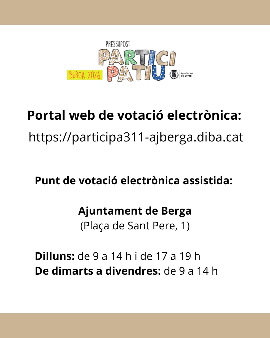 Paral·lelament, s’habilitarà un punt de votació electrònica assistida per poder participar en els dos processos de votació. Aquest punt de votació assistida estarà situat a la recepció de l’Ajuntament de Berga en els horaris següents: dilluns, de 9 a 14 h i de 17 a 19 h; dimarts, dimecres, dijous i divendres, de 9 a 14 h.