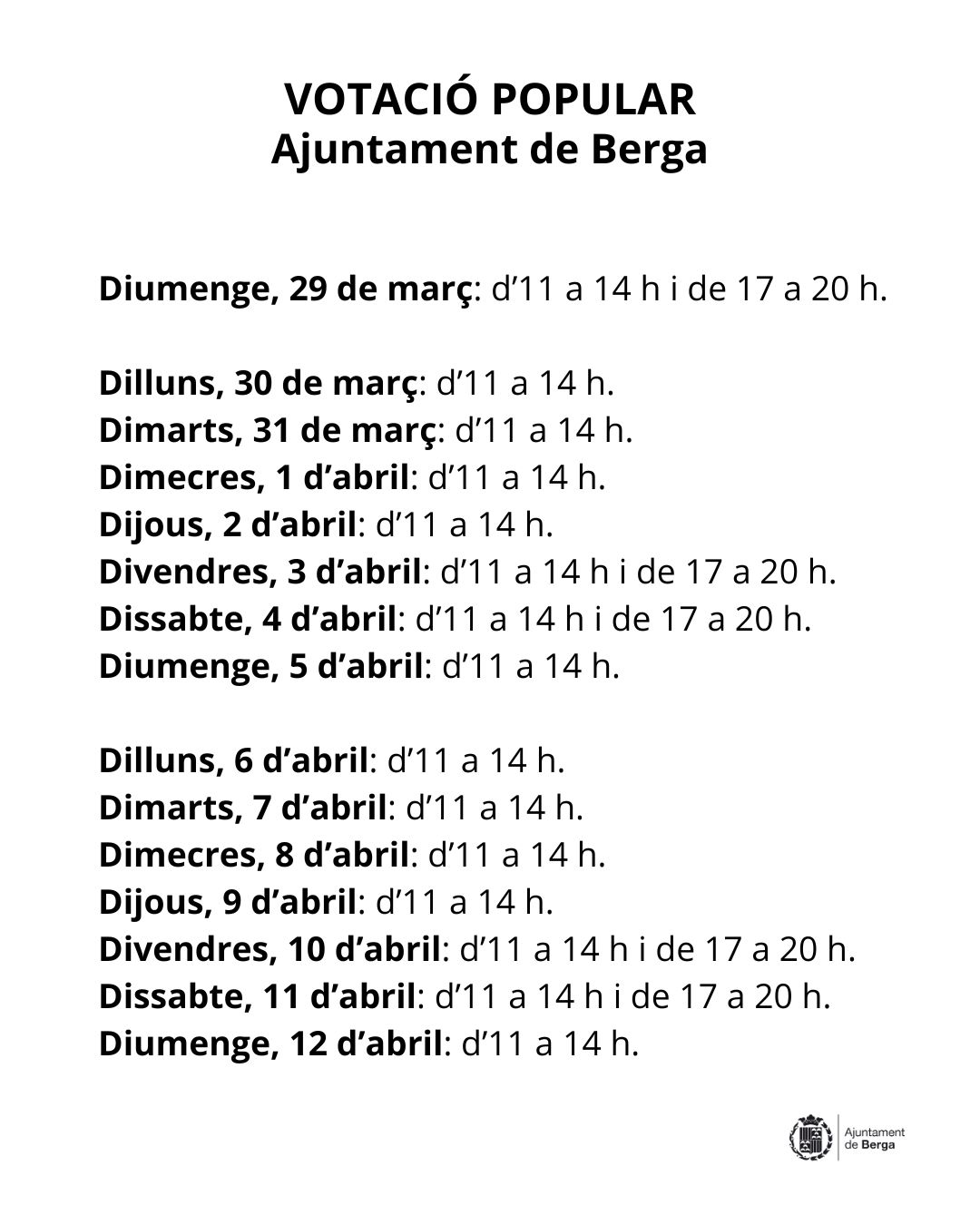 L’horari d’obertura de l’Ajuntament de Berga durant el període de votació dels cartells finalistes de La Patum i La Patum infantil de 2026 és el següent: