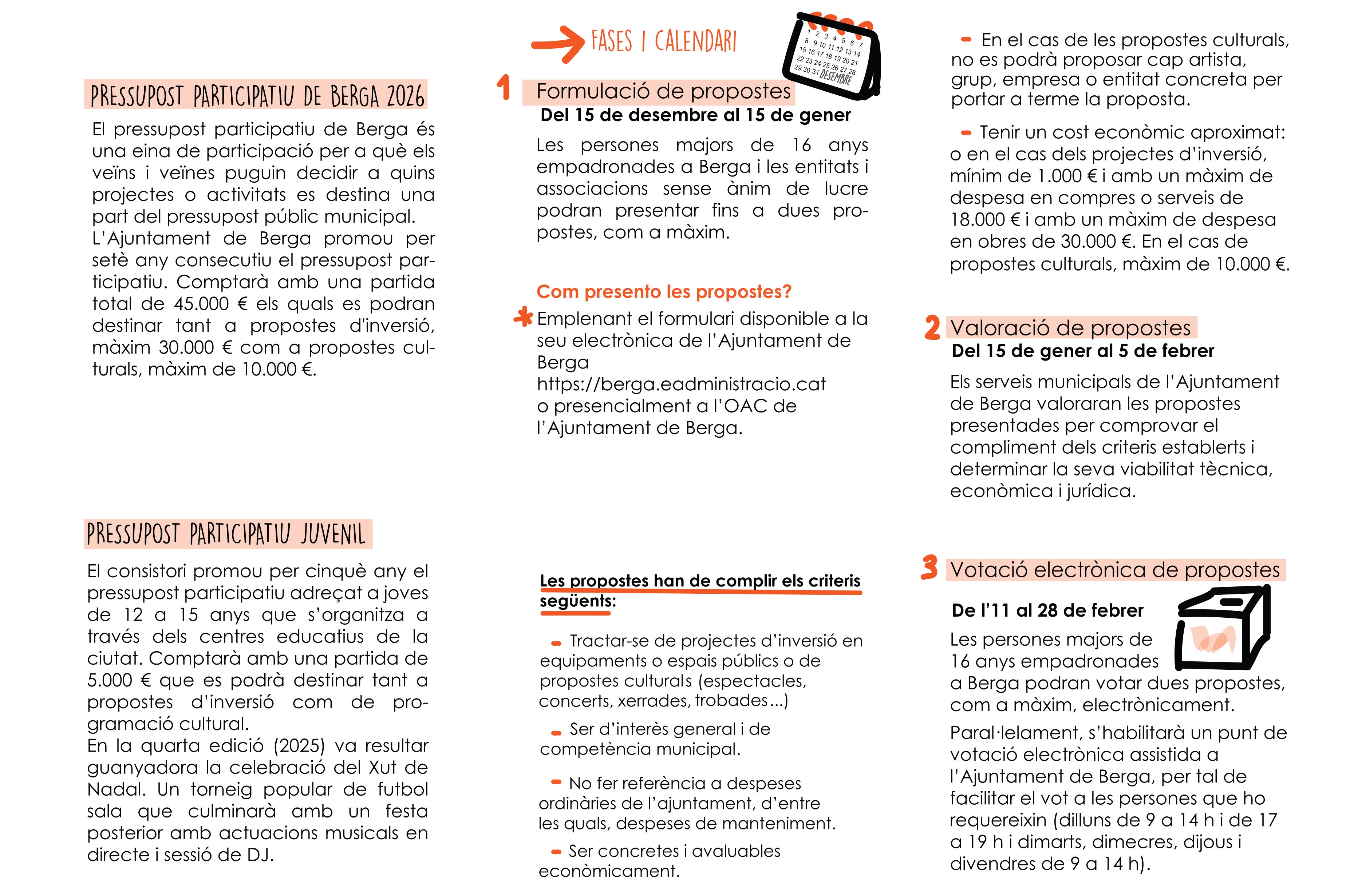 Les persones majors de 16 anys empadronades a Berga i les entitats i associacions sense ànim de lucre inscrites al registre municipal poden formular un màxim de dues propostes, en tots dos casos. Per fer-ho, cal emplenar un formulari disponible al web www.ajberga.cat i presentar-lo al registre general d’entrada de l’Ajuntament de Berga. Les persones físiques poden tramitar-ho de forma presencial o electrònica, mentre que les entitats i associacions només poden fer-ho electrònicament. Per tramitar les propostes en línia, cal disposar del certificat digital. El termini establert per a la formulació de propostes és del 15 de desembre de 2025 al 15 de gener 2026.