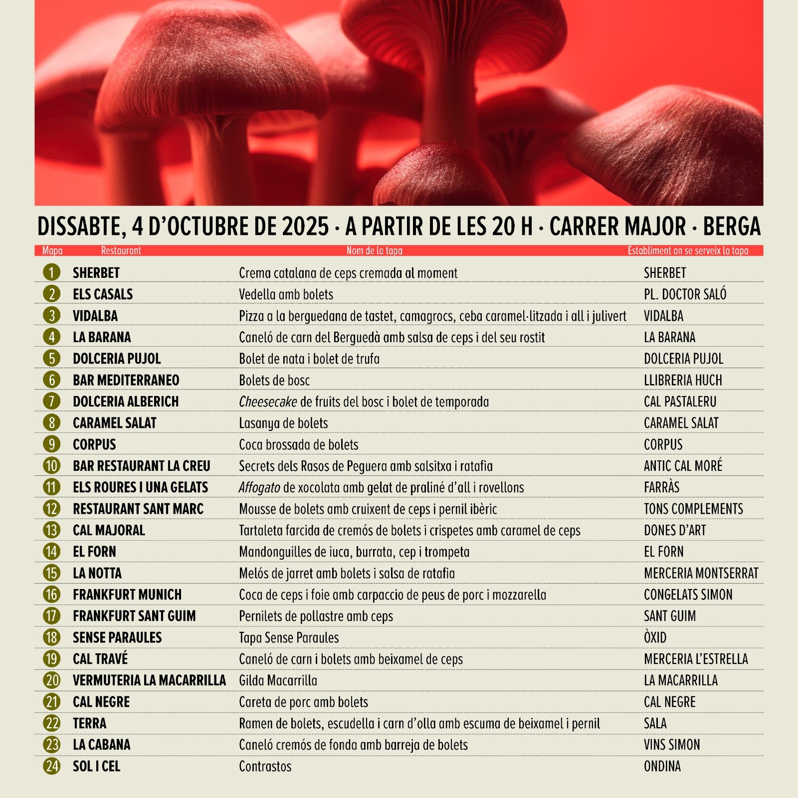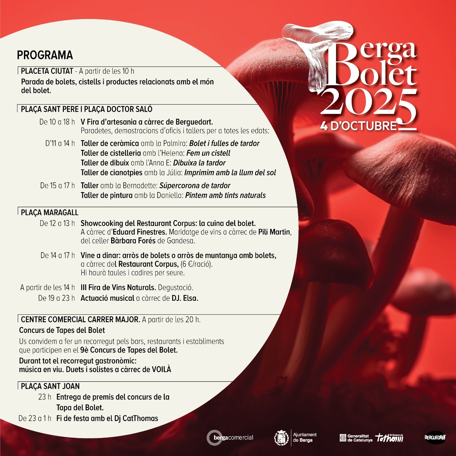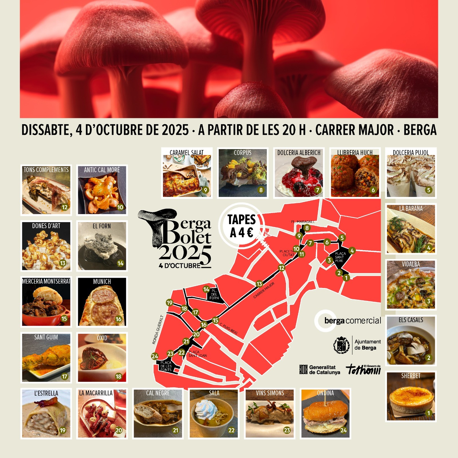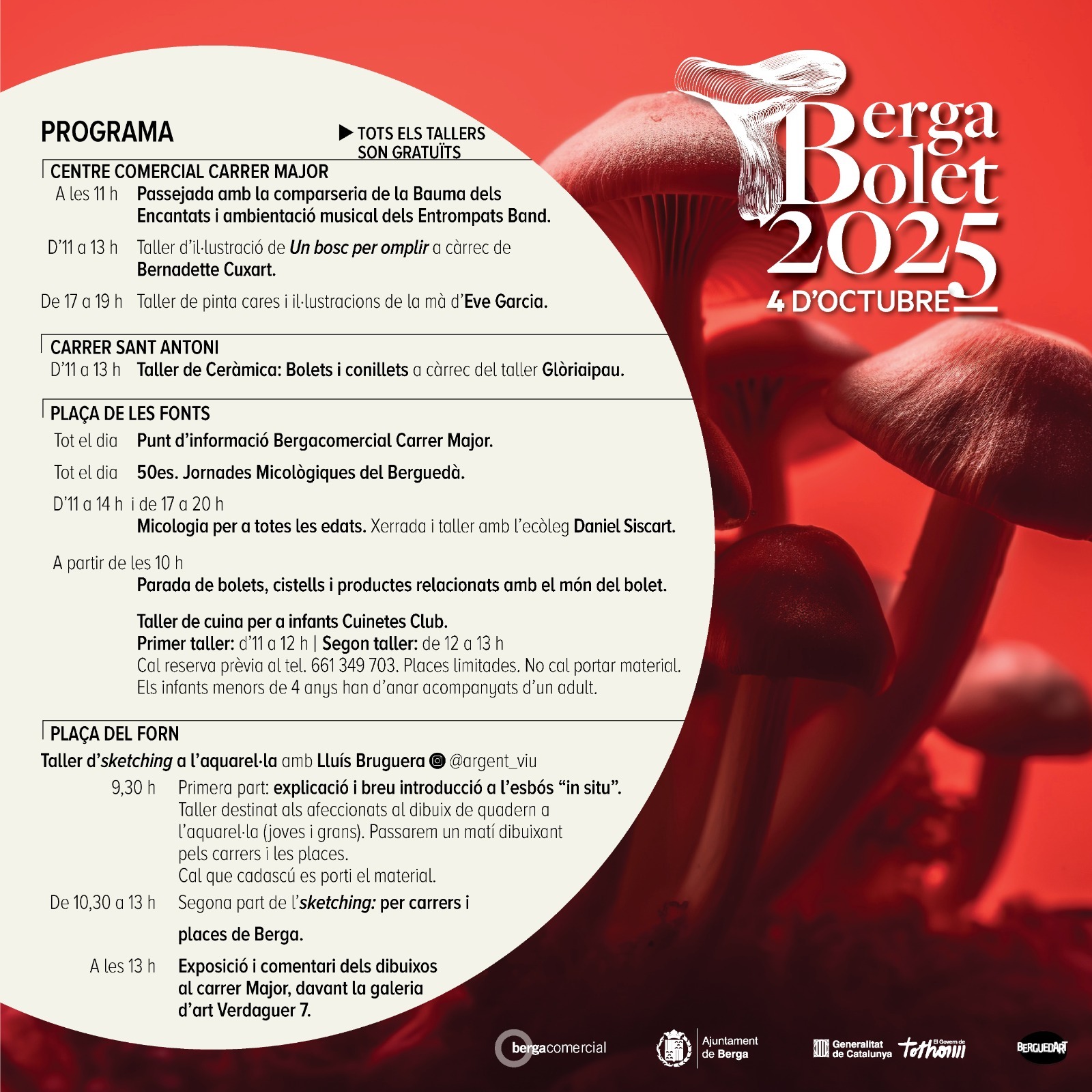 Berga acollirà una nova edició de la Bergabolet. L’esdeveniment se celebrarà el dissabte 4 d’octubre i comptarà amb una àmplia oferta d’activitats lúdiques i divulgatives per promoure el coneixement sobre un dels productes més nostrats de l’època tardorenca: el bolet!