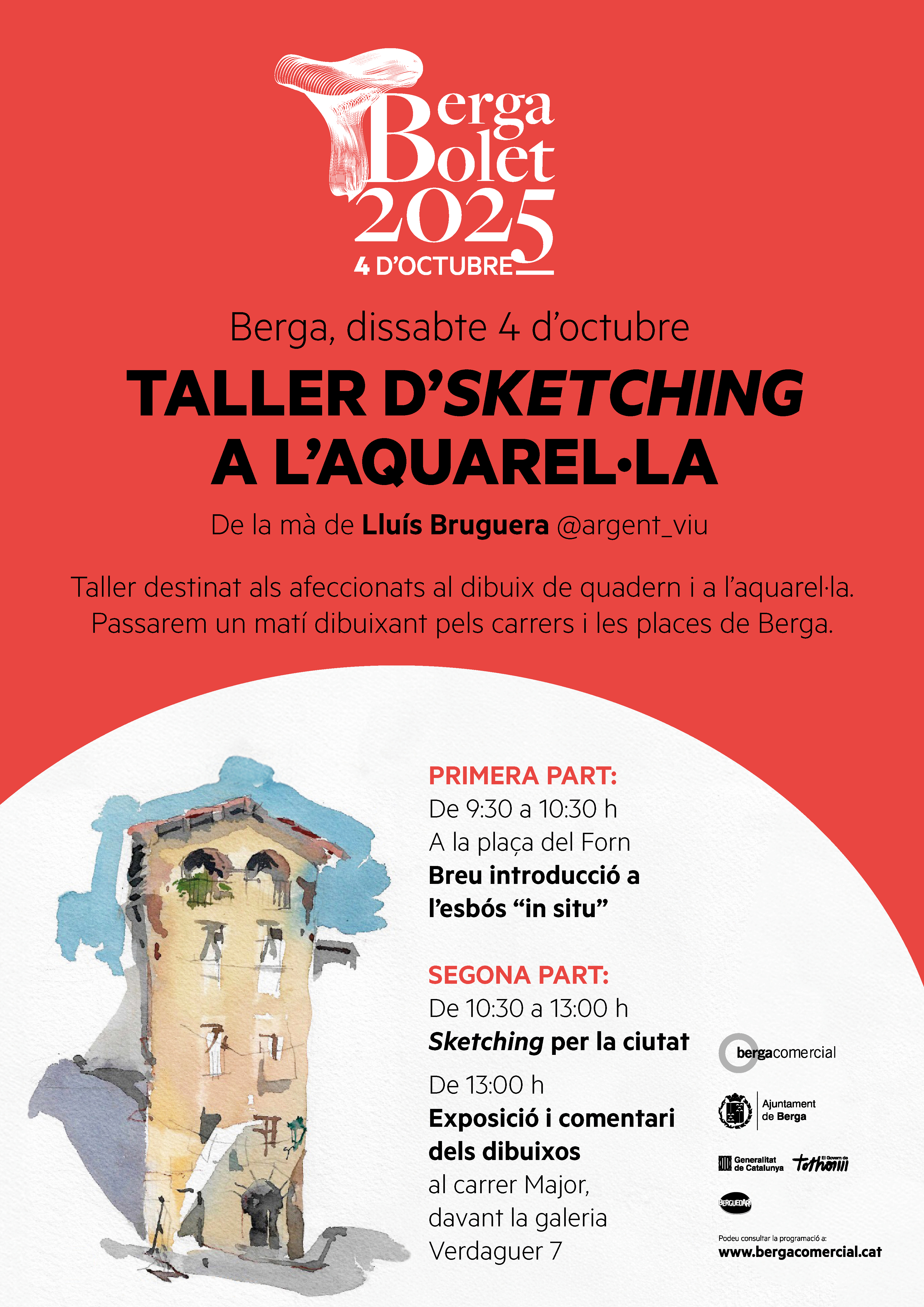 Aquest dissabte 4 d’octubre, en el marc de la Bergabolet, es farà un taller d’sketching destinat a les persones aficionades al dibuix de quadern i a l’aquarel·la. Passarem un matí dibuixant pels carrers i places de la ciutat de la mà de Lluís Bruguera.