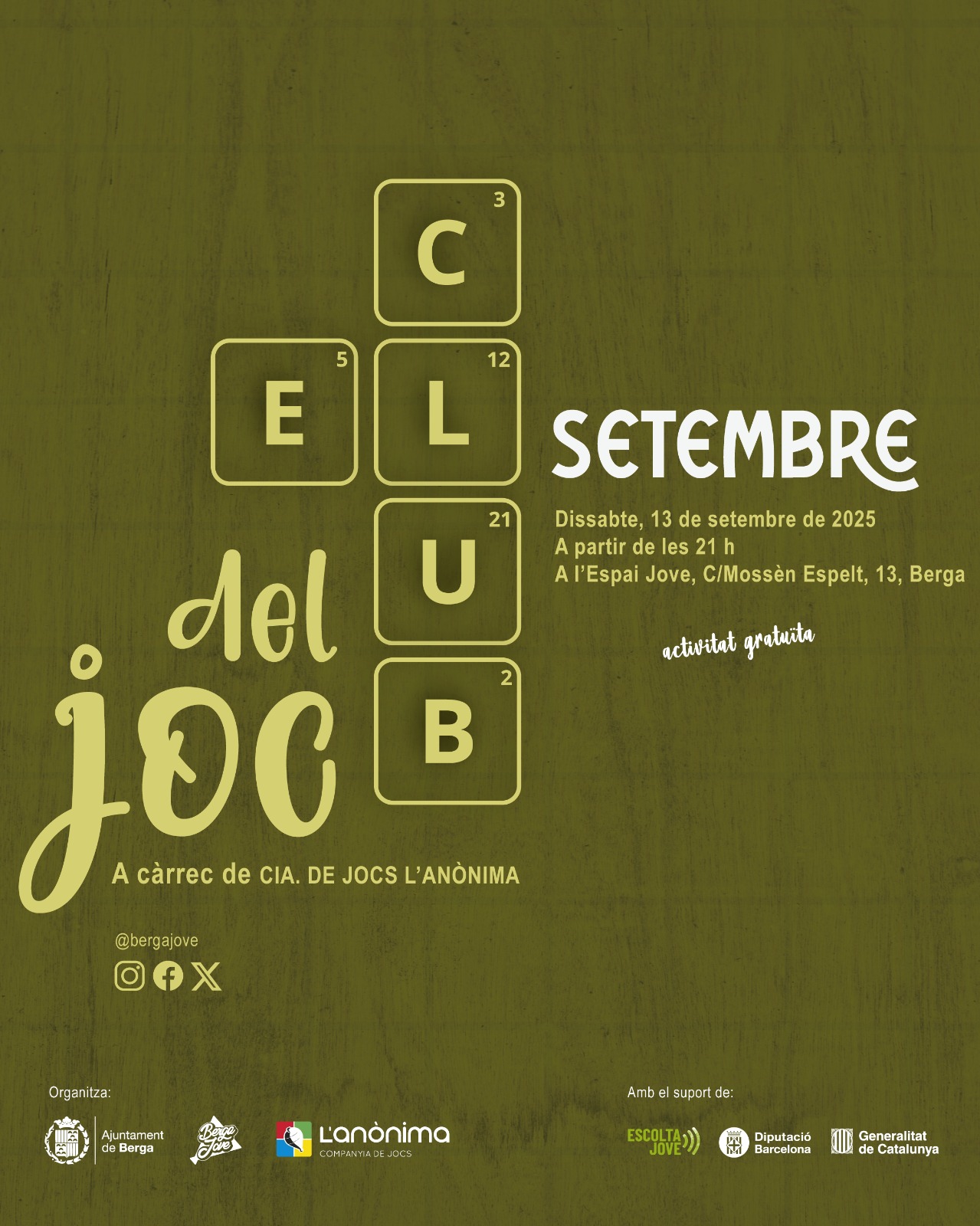 Les activitats són gratuïtes i estan impulsades per l’àrea de Joventut de l’Ajuntament de Berga i compta amb la dinamització de l’equip de monitoratge de la Cia. de Jocs l’Anònima.