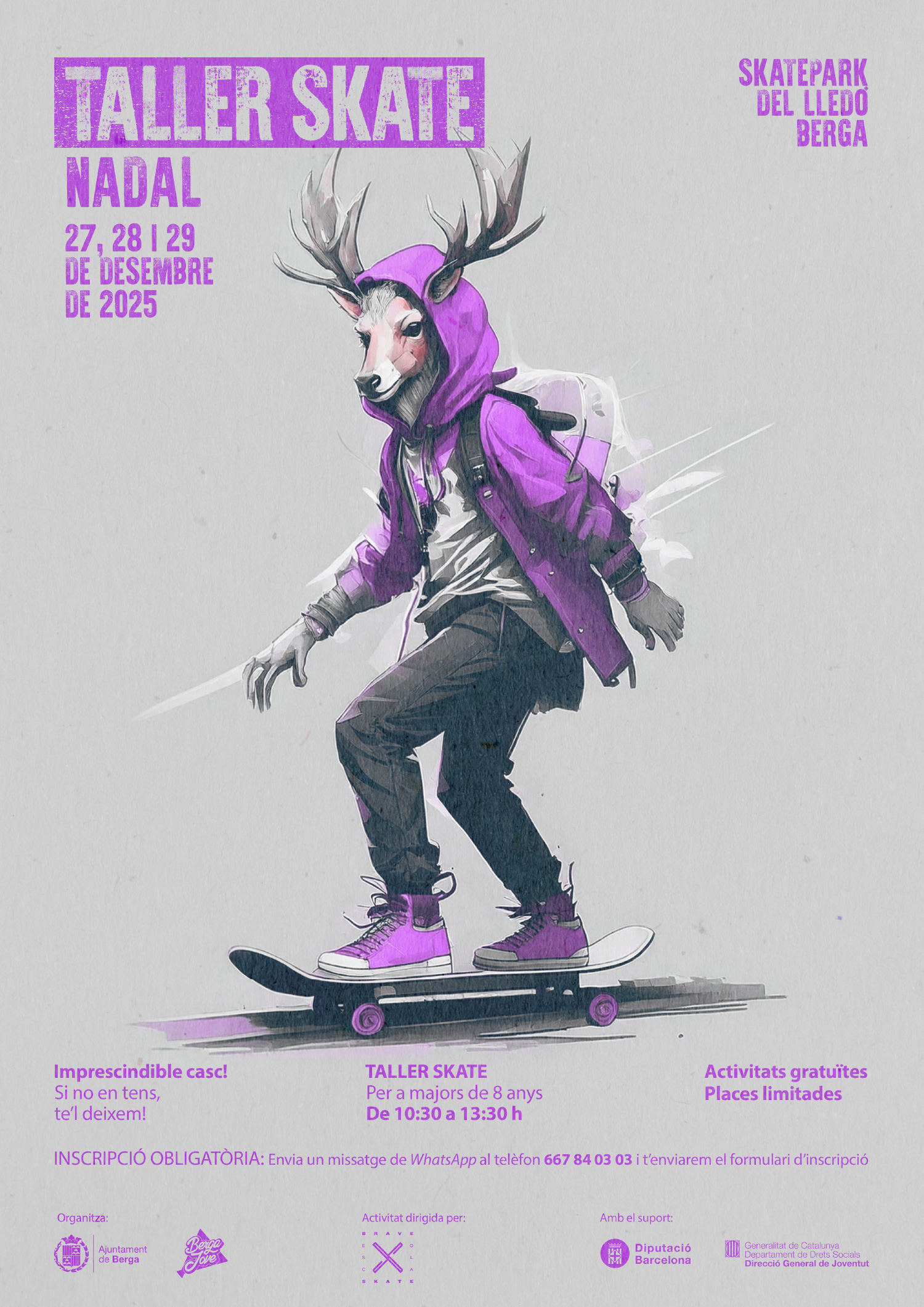Preparats per fer rodar l’energia nadalenca? Aquest Nadal torna l’skate al Skatepark del Lledó amb els tallers organitzats per l’àrea de Joventut de l’Ajuntament de Berga i BraveSkate! Tres matins per aprendre a fer acrobàcies, guanyar confiança i gaudir de l’skate en un ambient festiu i ple de bones vibracions.