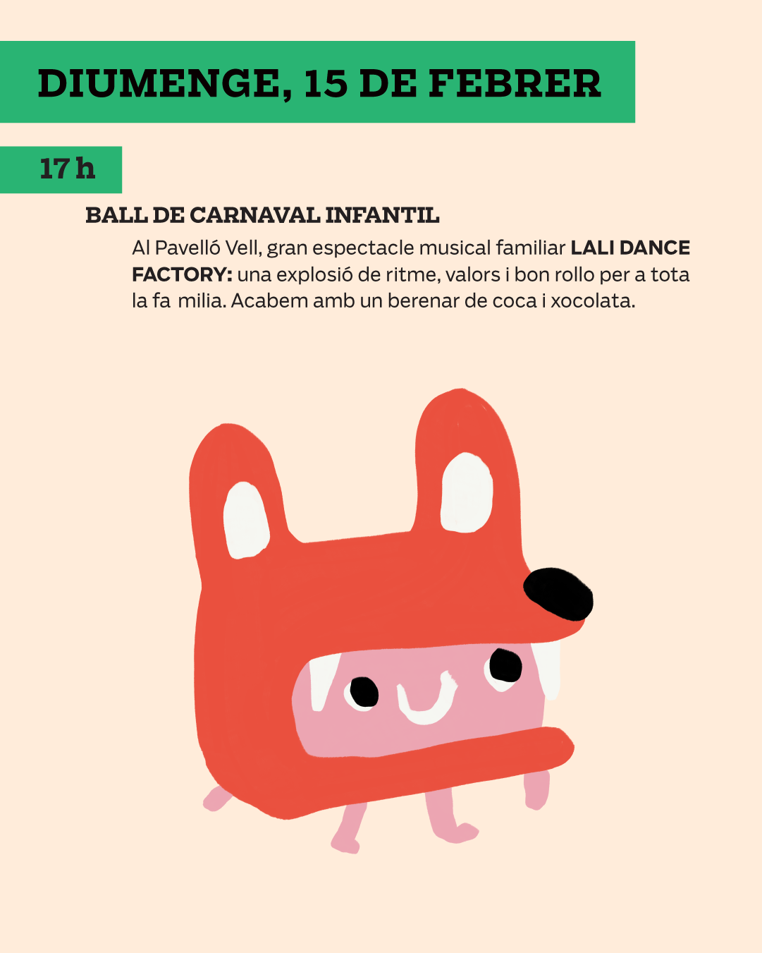El Pavelló Vell acollirà el Ball de Carnaval Infantil. L’esdeveniment estarà amenitzat per Lali BoGood amb l’espectacle familiar Lali Dance Factory. Es tracta d’una proposta que fusiona música, ball i missatge amb una posada en escena vibrant i plena d’energia. Acompanyada per quatre ballarines i una DJ-baterista, la Lali desplegarà el seu repertori més potent amb coreografies divertidíssimes a ritme de funky, pop urbà, hip hop, afro i ska, juntament amb alguns èxits mundials i una estètica pop que esclata en colors, llums i moviment.