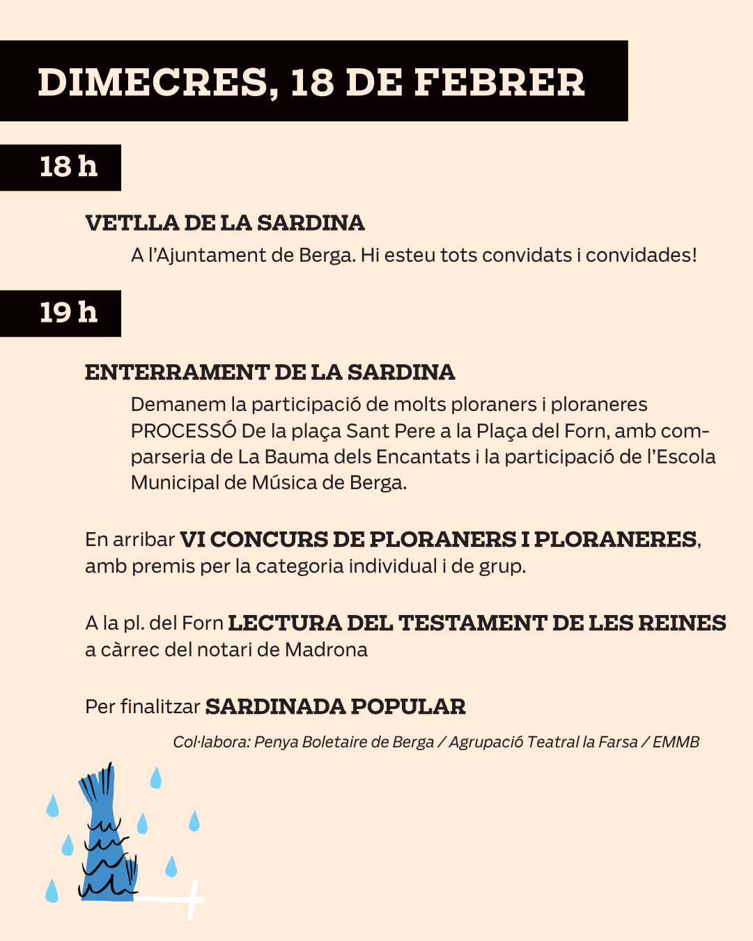 Els actes del dimecres de cendra són organitzats per l’Ajuntament de Berga i l’Agrupació Teatral la Farsa amb la participació de l’Escola Municipal de Música de Berga i la col·laboració de la Penya Boletaire de Berga.