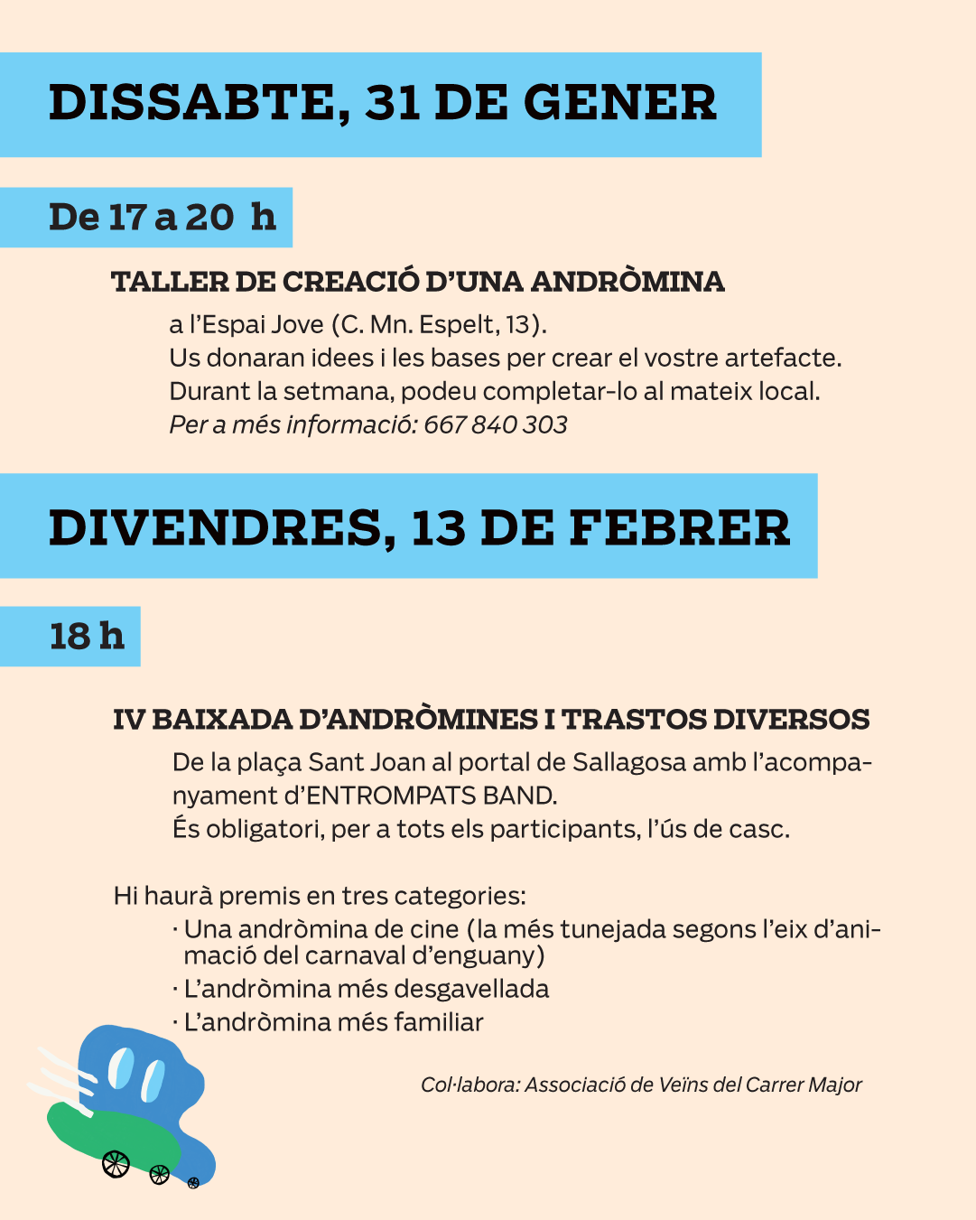 Els participants hauran de portar l’element que s’utilitzarà com a estructura principal de l’andròmina (carretó, patinet, bicicleta, etc.) i altres materials reciclats per complementar la fabricació dels bòlids (caixes, fustes, cartró, etc.).