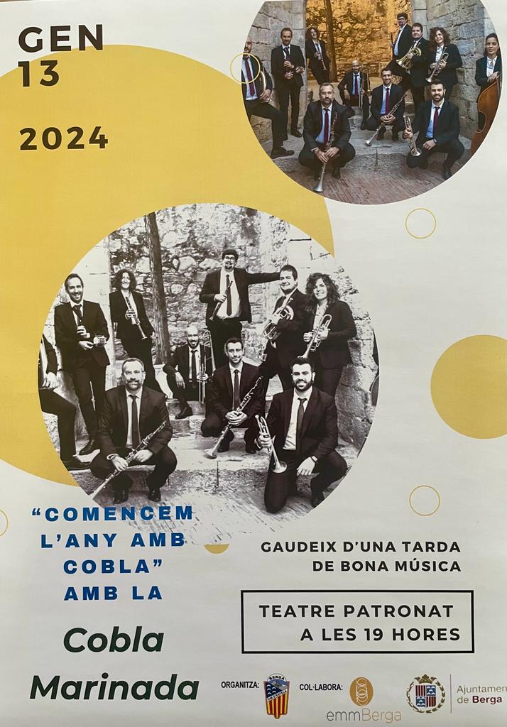 El Teatre Patronat acollirà un concert amb la Cobla Marinada titulat Comencem l’any amb cobla sota la direcció d’Edmon Colomer. L’esdeveniment està impulsat per la Colla Sardanista Cim d’Estela amb la col·laboració de l’Escola Municipal de Música de Berga i l’Ajuntament de Berga.