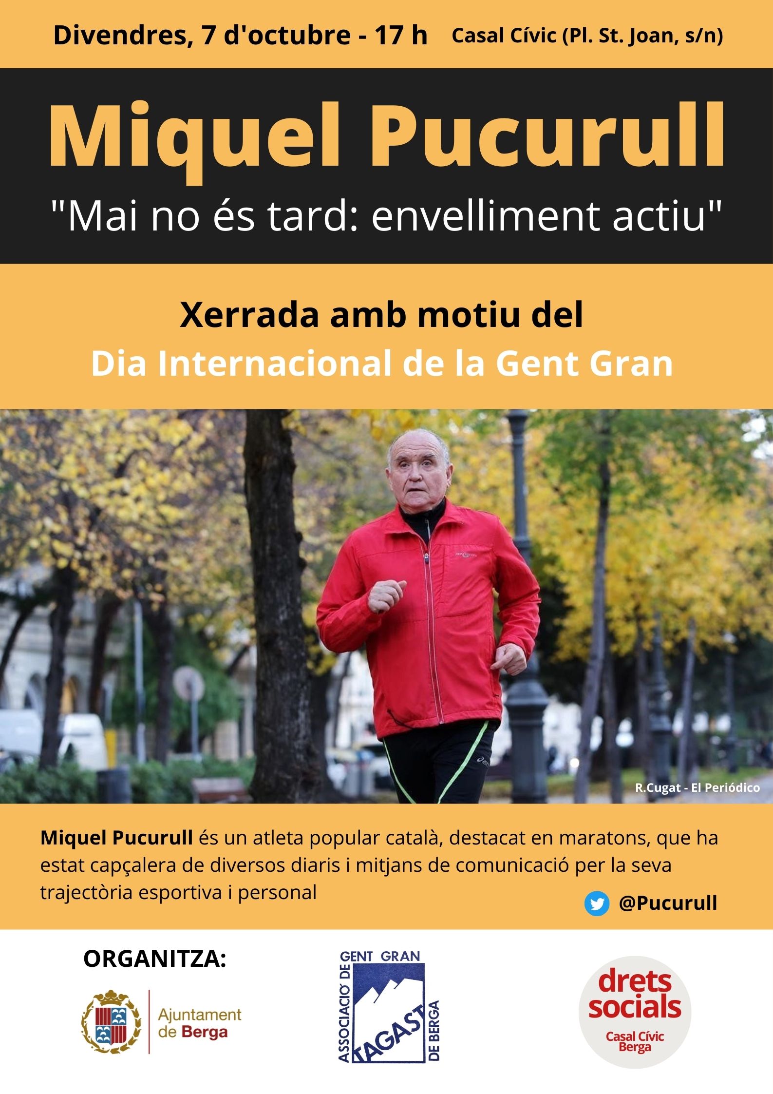 La conferència titulada “Mai no és tard: envelliment actiu” estarà protagonitzada per Miquel Pucurull, un popular atleta català, destacat en maratons, que ha estat capçalera de diversos diaris i mitjans de comunicació per la seva trajectòria esportiva i personal.
