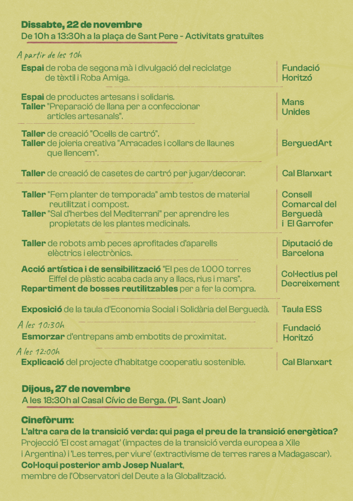 Per altra banda, el dijous 27 de novembre a les 18:30 h, el Casal Cívic i Comunitari de Berga acollirà un cinefòrum on es projectaran els documentals El cost amagat i Les terres per viure. Aquesta activitat, coordinada per l’Ateneu Cooperatiu de la Catalunya Central, tancarà les activitats de la Setmana Europea de la prevenció de residus al Berguedà.
