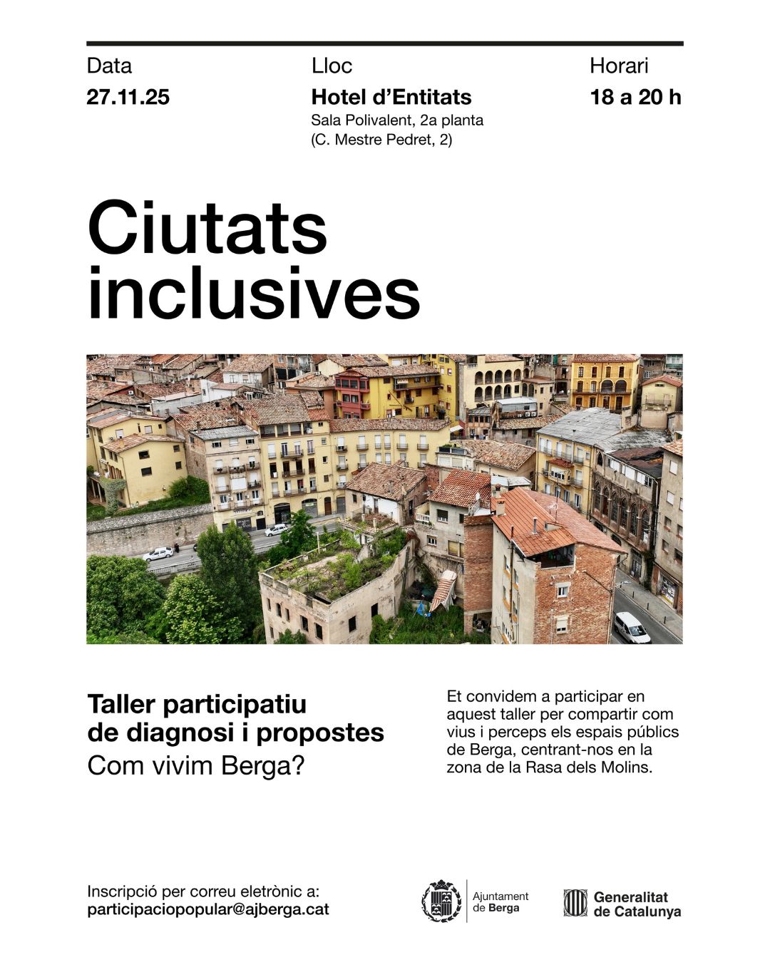 ‘Ciutats Inclusives’ té per objectiu millorar la qualitat dels espais públics per fer-los més acollidors, diversos i accessibles. La iniciativa combina el coneixement tècnic amb la participació ciutadana, recollint les vivències, opinions i necessitats de les persones que fan vida als barris. El taller es farà dijous 27 de novembre, de 18 a 20 h, a l’Hotel d’Entitats. Per participar-hi cal inscriure’s prèviament enviant un correu electrònic a participaciopopular@ajberga.cat.