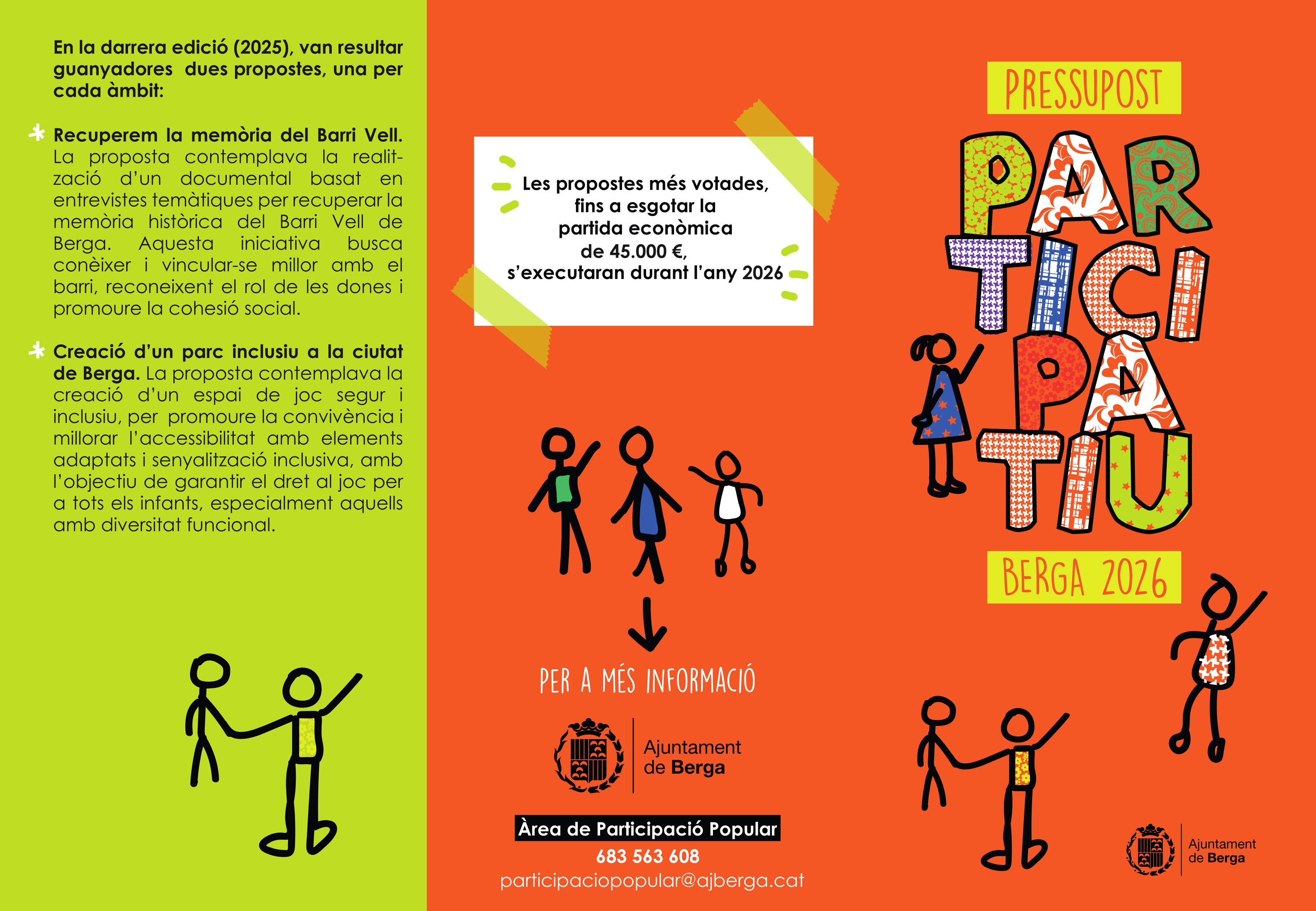 Les persones majors de 16 anys empadronades a Berga i les entitats i associacions sense ànim de lucre inscrites al registre municipal poden formular un màxim de dues propostes, en tots dos casos. Per fer-ho, cal emplenar un formulari disponible al web www.ajberga.cat i presentar-lo al registre general d’entrada de l’Ajuntament de Berga. Les persones físiques poden tramitar-ho de forma presencial o electrònica, mentre que les entitats i associacions només poden fer-ho electrònicament. Per tramitar les propostes en línia, cal disposar del certificat digital. El termini establert per a la formulació de propostes és del 15 de desembre de 2025 al 15 de gener 2026.