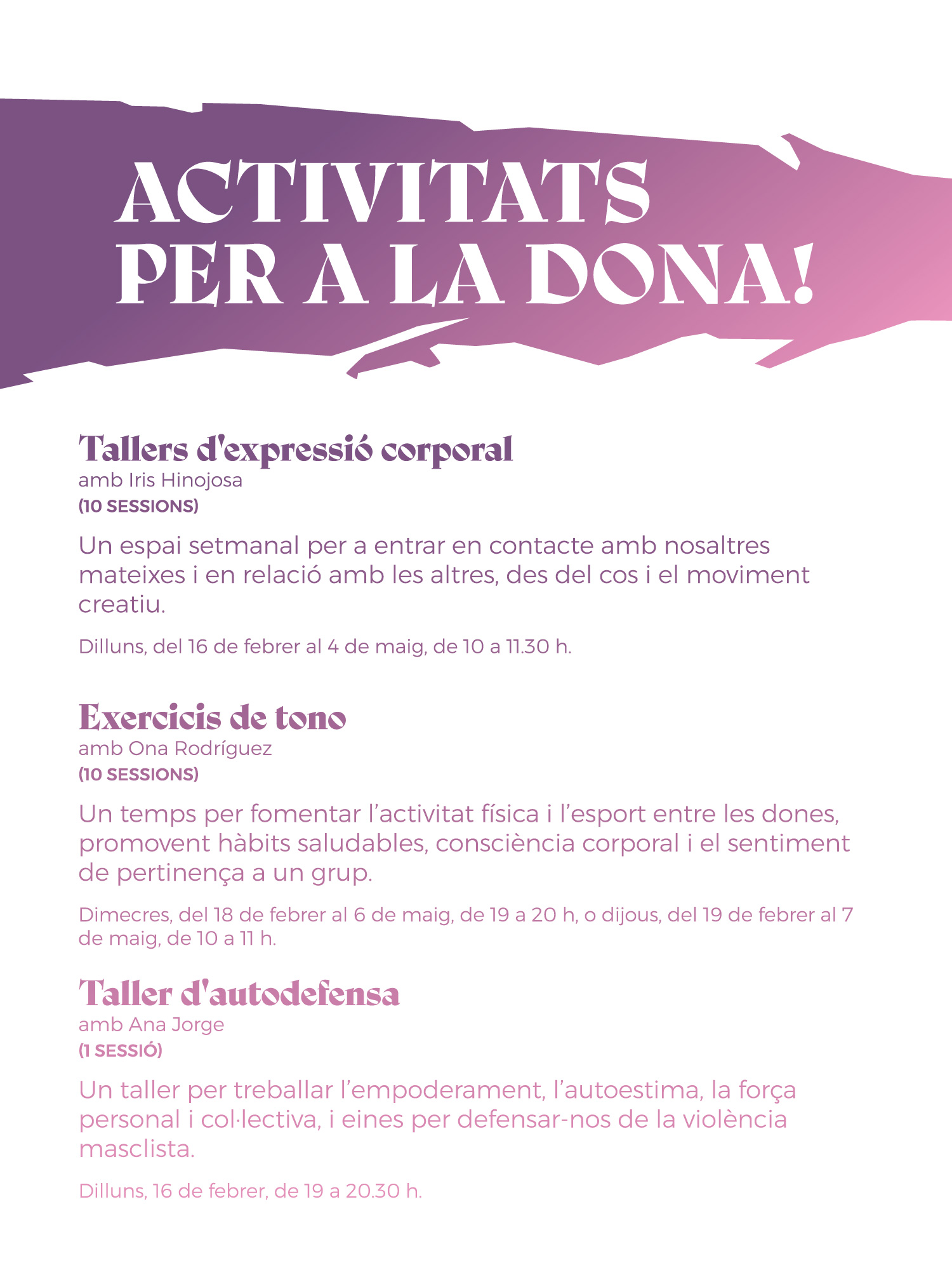 La tercera proposta programada és un taller d’autodefensa feminista per treballar l’empoderament, l’autoestima, la força personal i col·lectiva, així com diferents eines per defensar-se de les violències masclistes. L’activitat estarà dinamitzada per Ana Jorge i es farà el dilluns, del 16 de febrer, de 19 a 20:30 h.