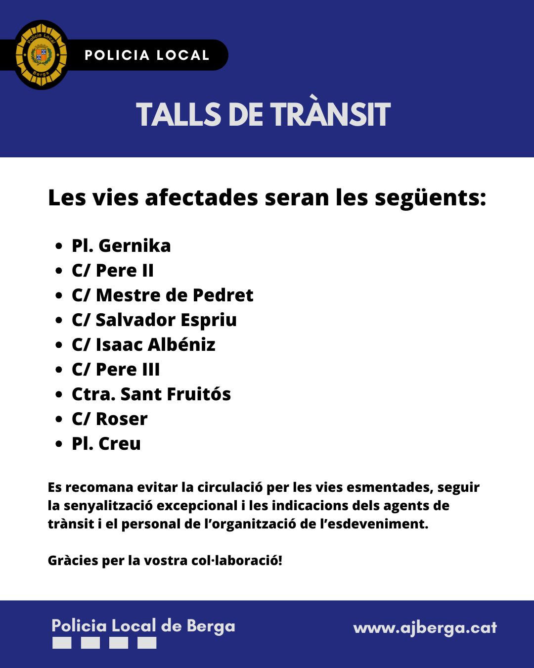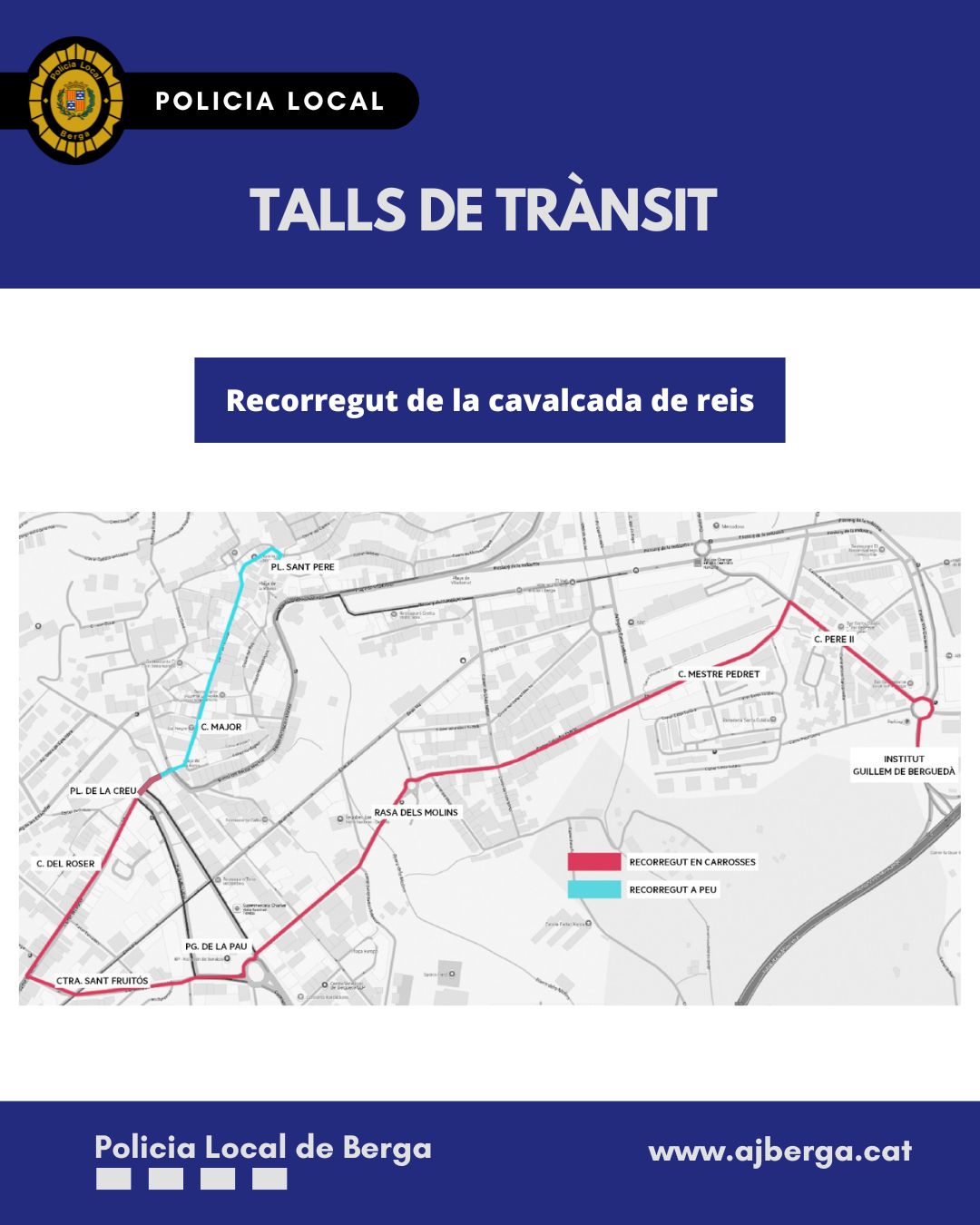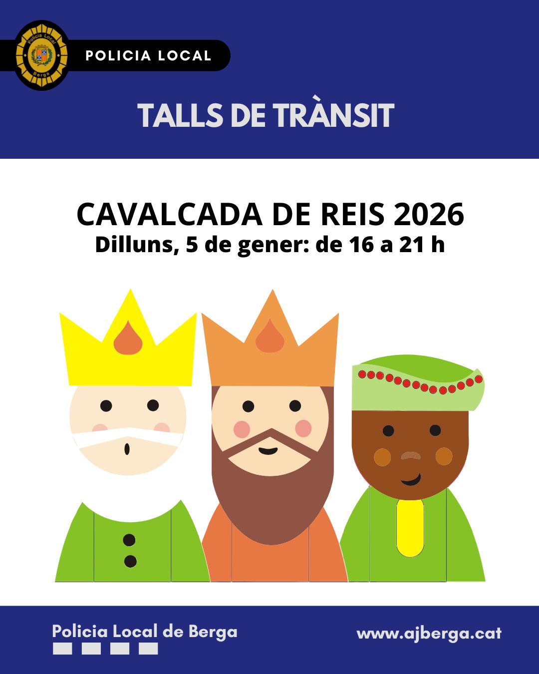 El desenvolupament de la cavalcada de reis comportarà talls en la circulació de vehicles en les vies per on transcorrerà l’itinerari de la comitiva reial, de les 16 a les 21 h, aproximadament. Es recomana evitar la circulació per les vies esmentades, seguir la senyalització excepcional i les indicacions dels agents de trànsit i el personal de l’organització de l’esdeveniment.