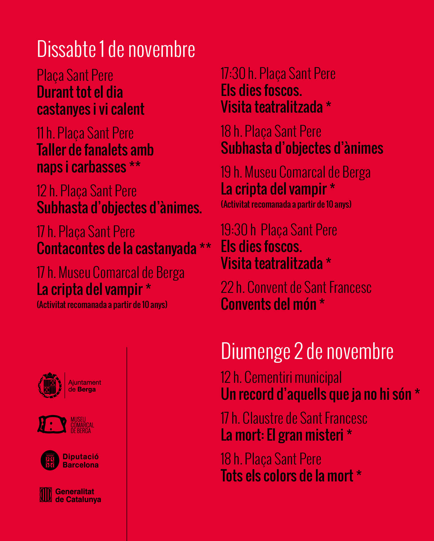 La ‘Trilogia de la mort’ ofereix una àmplia programació de propostes en diversos formats per descobrir llegendes, històries, personatges i tradicions sobre la mort arreu del món, passejant per diferents racons del barri vell i recorrent el cementiri municipal i el convent de Sant Francesc. L’edició d’enguany comptarà amb vuit rutes guiades i visites teatralitzades gratuïtes, que es portaran a terme en diferents torns. Les places són limitades i caldrà inscriure’s prèviament a l’Oficina de Turisme de Berga, a través del telèfon (93 821 13 84) o l’adreça de correu electrònic aj022.ofturisme@ajberga.cat.
