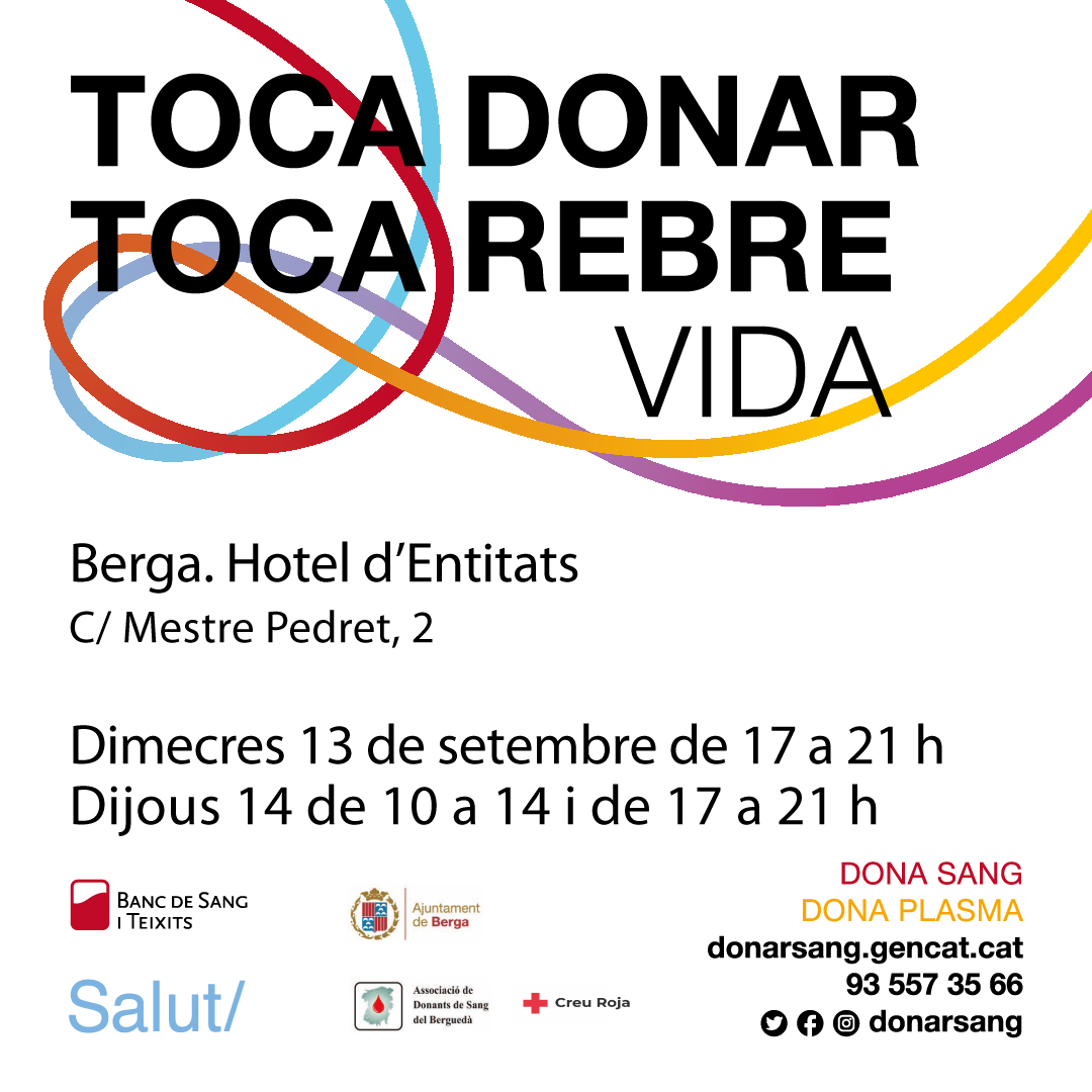 Donar sang i plasma és un gest que connecta vides. Les campanyes de donació permeten mantenir les reserves en un estat òptim per tal de fer front a les necessitats de les persones afectades per diverses malalties. La capital berguedana tornarà a adherir-se a la iniciativa de Banc i Sang i Teixits acollint dues jornades d’acapte de sang i plasma que es portaran a terme els dies 13 i 14 de setembre, a l’Hotel d’Entitats. Els horaris de la donació seran els següents: dimecres, de 17 a 21 h i dijous, de 10 a 14 h i de 17 a 21 h. Per participar en les jornades programades es pot reservar cita a través el portal web donarsang.gencat.cat.