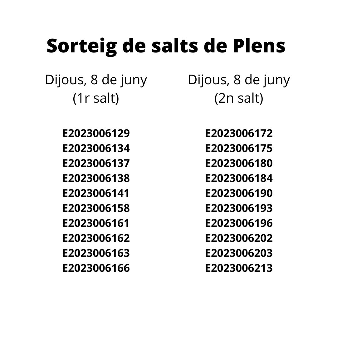 D’altra banda, també s’ha fet el sorteig de 5 salts d’àngels corresponents a La Patum completa de dijous (3) i diumenge (2); 2 salts de maces de lluïment, un dijous i un altre diumenge. A més, s’ha fet el sorteig de 40 salts de plens corresponents a La Patum completa de dijous (20) i diumenge (20).