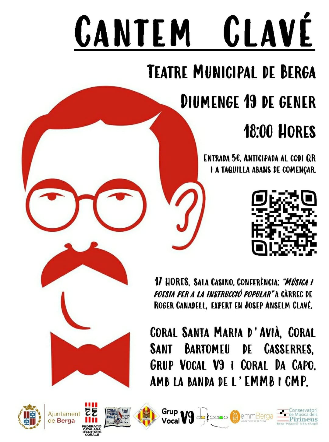 El diumenge 19 de gener, a les 18 h, el Teatre Municipal de Berga acollirà un concert excepcional dedicat a la figura d’Anselm Clavé, una personalitat clau de la cultura catalana, amb motiu del bicentenari del seu naixement. La proposta pretén fer reviure l'esperit de la seva música popular a través d’una selecció del seu repertori per a cor i banda.